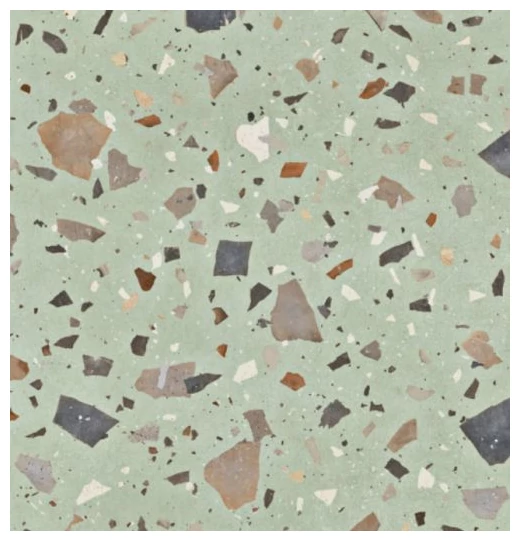 Płytki Pebble Green Natural od Aparici w kolekcji Pebble to przykład gresu wielkoformatowego o wymiarach 99,55 x 99,55 cm. Mocno zauważalnym jest tu efekt lastryko, który uzyskuje się poprzez różnorodne, nieregularne fragmenty o różnych kształtach i barwach osadzone na zielonym tle. To matowe wykończenie sprawia, że powierzchnia prezentuje się naturalnie, bez połysku, co podkreśla charakter materiału i dodaje prawdziwości całemu wzorowi.