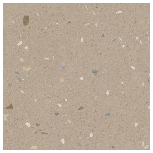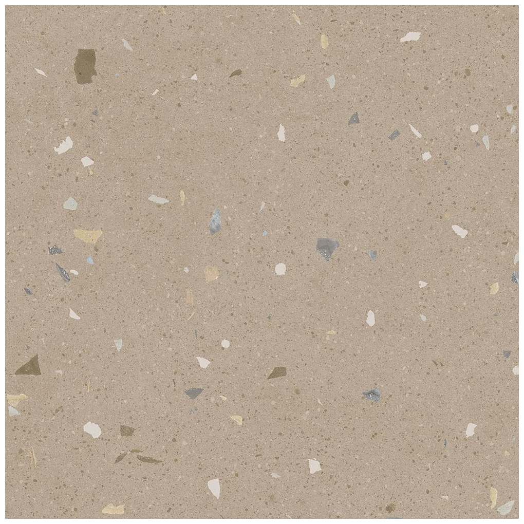 Wzór płytki Croccante Avellana to przykład surowego, lecz przemyślanego designu. Jasnobeżowe tło przełamuje zróżnicowany rozmiar i kolor fragmentów lastryko - od odcieni bieli, przez szarości, aż po delikatne brązy. To sprawia, że powierzchnia zyskuje sporo wizualnej głębi i lekkości. Matowe wykończenie wzmacnia naturalny charakter gresu, eliminując odblaski i podkreślając jego strukturę.