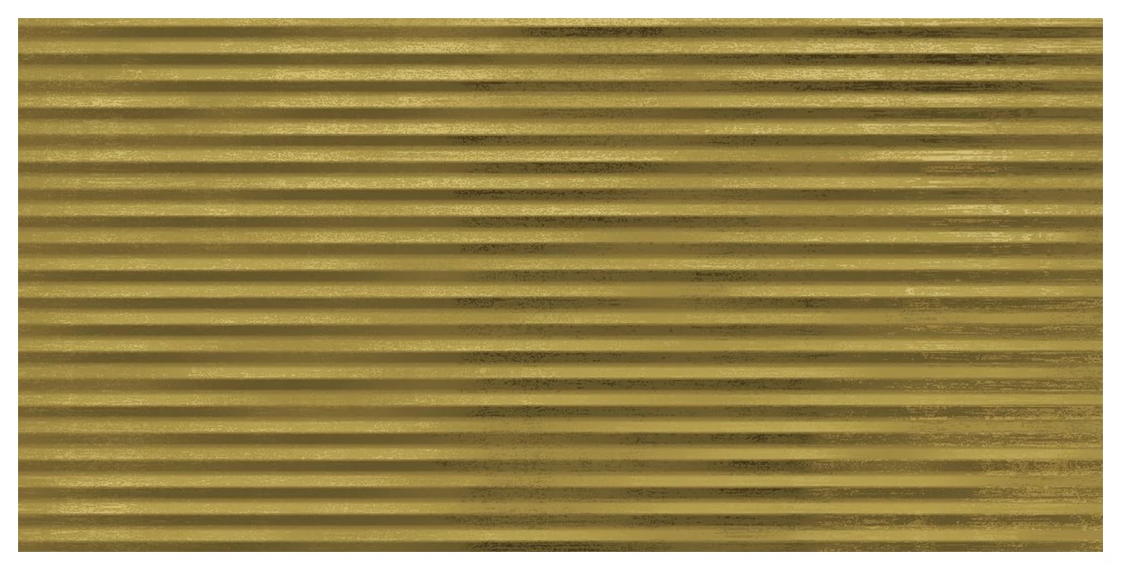 Book Gold Blind to płytka w formacie 49,75x99,55 o wyraźnym, poziomym ryflowaniu. Widoczna na powierzchni seria równomiernych żłobień nadaje jej zdecydowaną fakturę, kolorystycznie utrzymana jest w tonacji złota, co widać w subtelnym połysku lappato. Rektyfikowane krawędzie sprawiają, że po ułożeniu fugi mogą być minimalne i rysunek zachowa ciągłość.