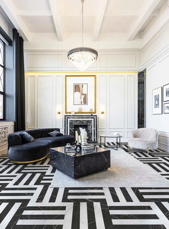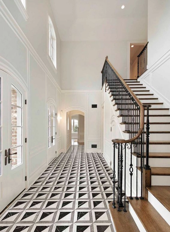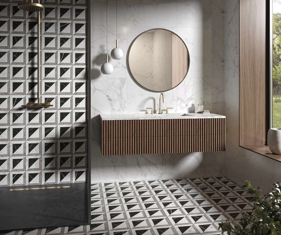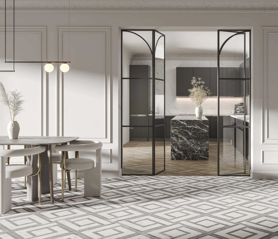 Przy układaniu warto przewidzieć próbny rozkład płytek, żeby poprowadzić pasy w sposób estetyczny względem kształtu pomieszczenia. Ze względu na format 59,55x59,55 i rektyfikację, zalecane są cienkie fugi - to podkreśli geometryczny charakter wzoru.