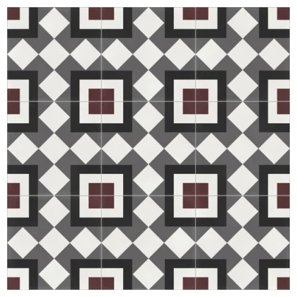 Vienna Urania Natural to gres wielkoformatowy o wymiarach 59,2x59,2 cm. Jego powierzchnia jest matowa, co nadaje całości wyraźny, ale stonowany efekt bez zbędnego połysku. Geometryczny, wyrazisty wzór układa się w uporządkowane figury - czarne i bordowe kwadraty na tle szarości i bieli, tworząc wyraźny kontrast. Ten charakterystyczny patchwork daje przestrzeni wyrazistość i pomaga wyznaczać miejsca z klasą i bez przesady.