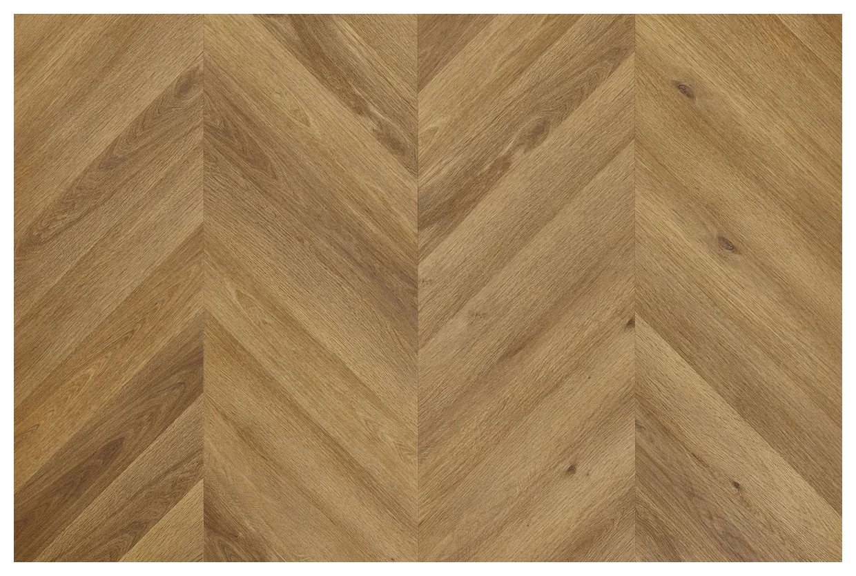 To panel z kolekcji Amaron Chevron od producenta Arbiton, prezentowany w klasycznym układzie jodełki. Widoczna powierzchnia ma wyraźny rysunek słojów i punktowe sęki, utrzymane w ciepłej, średnio-brązowej tonacji dębu. Układ elementów tworzy geometryczny wzór V, który jednocześnie porządkuje przestrzeń i nadaje jej strukturę.