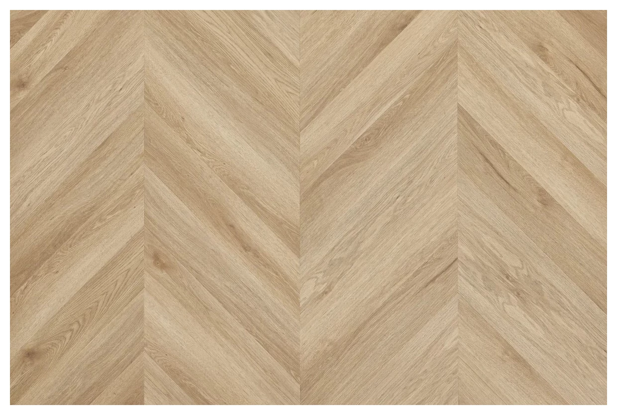 Panel winylowy z kolekcji Amaron Chevron o wyraźnym wzorze jodełki. Na powierzchni widoczny jest jasny, dębowy dekor o zróżnicowanym usłojeniu i subtelnych sękach, utrzymany w ciepłych, naturalnych tonach. Arbiton jako producent stawia tu na czytelny, klasyczny odcień dębu, który nie dominuje przestrzeni, ale ją uzupełnia.