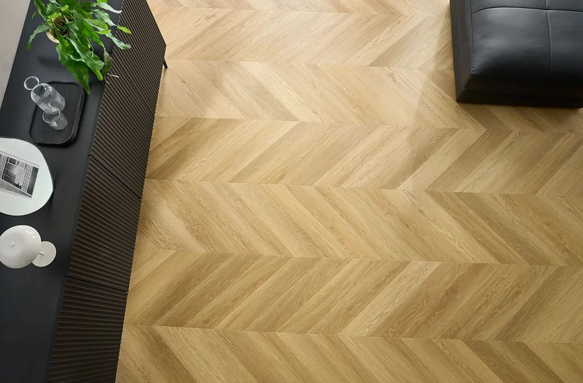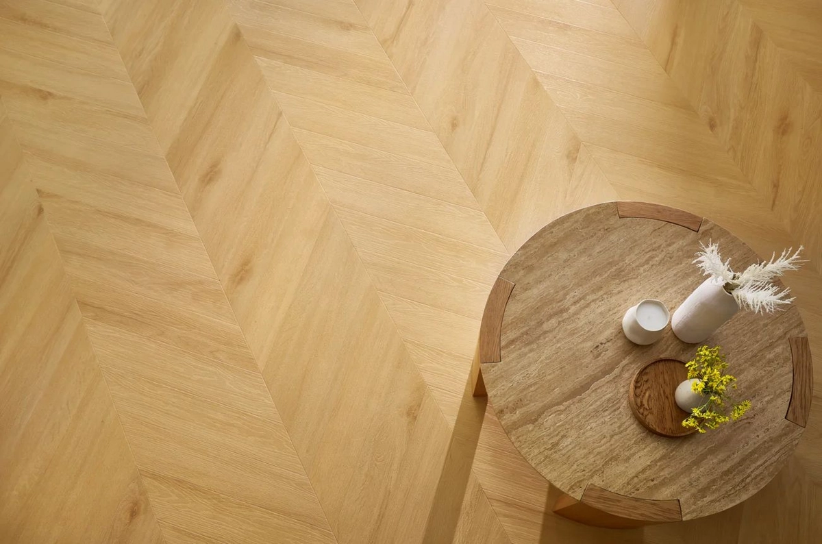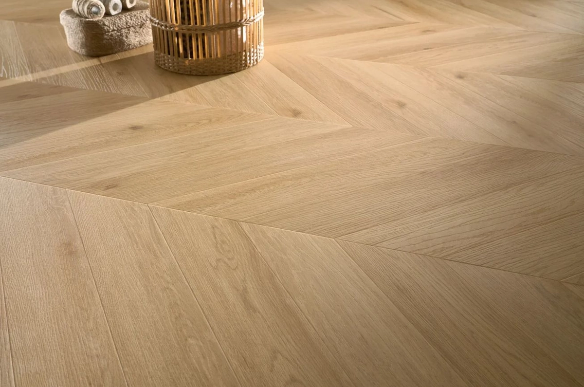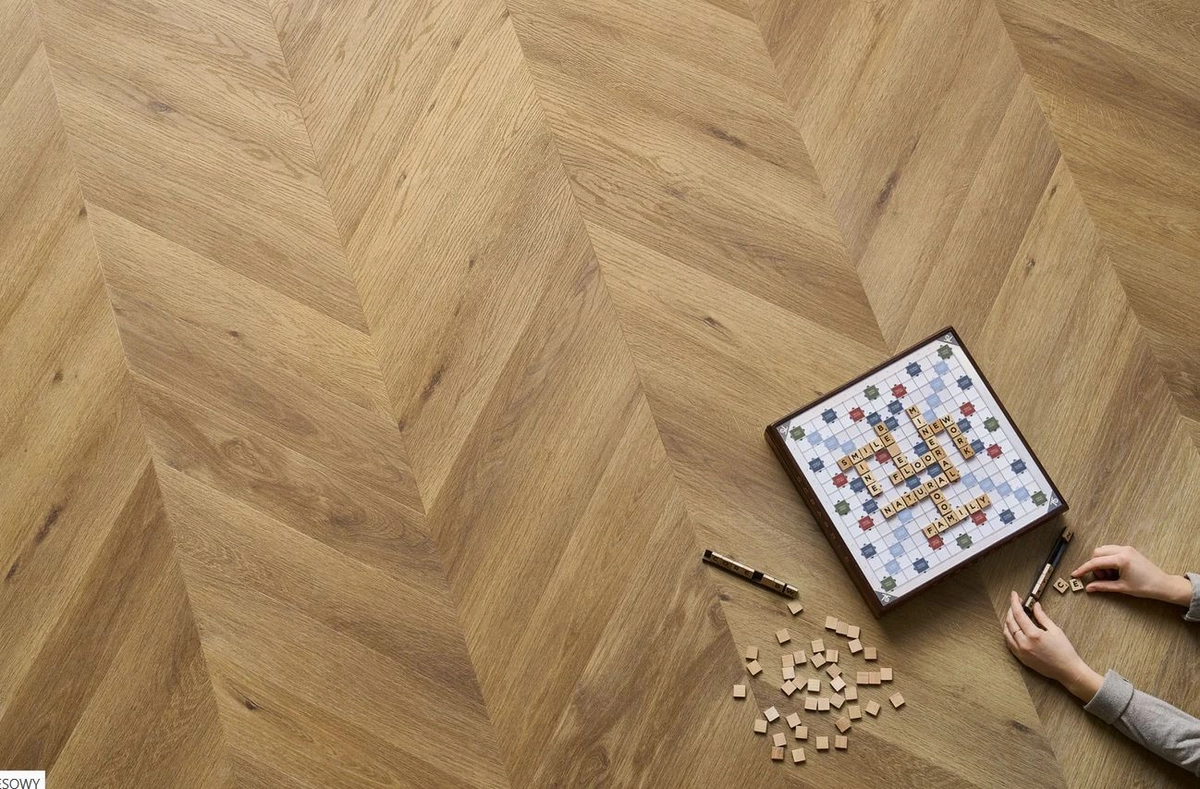 Wzór ułożony w jodełkę tworzy powtarzalne, wyraźne szewrony, co warto wykorzystać projektowo - efekt jest uporządkowany, a jednocześnie dynamiczny. Powierzchnia zdaje się mieć matowe wykończenie z delikatną strukturą drewna, co ogranicza refleksy i ułatwia dopasowanie do różnych źródeł światła.