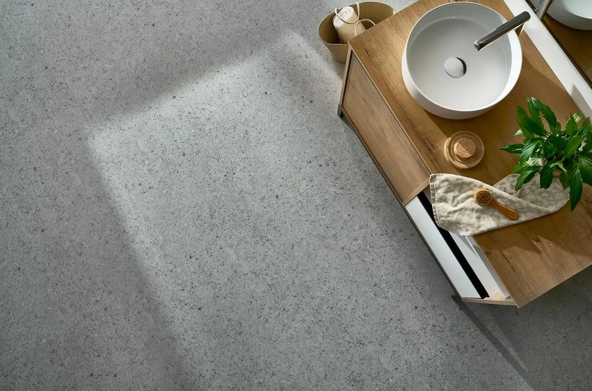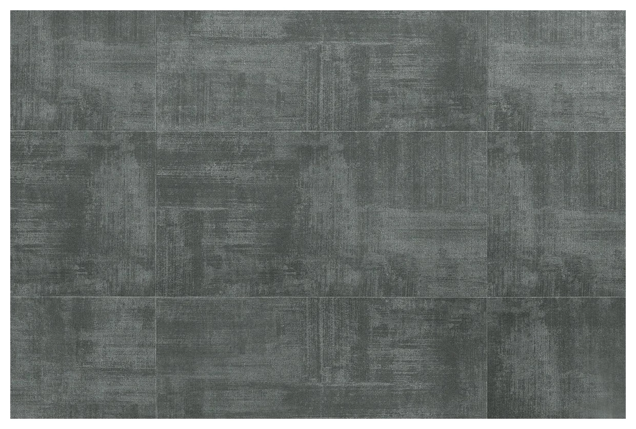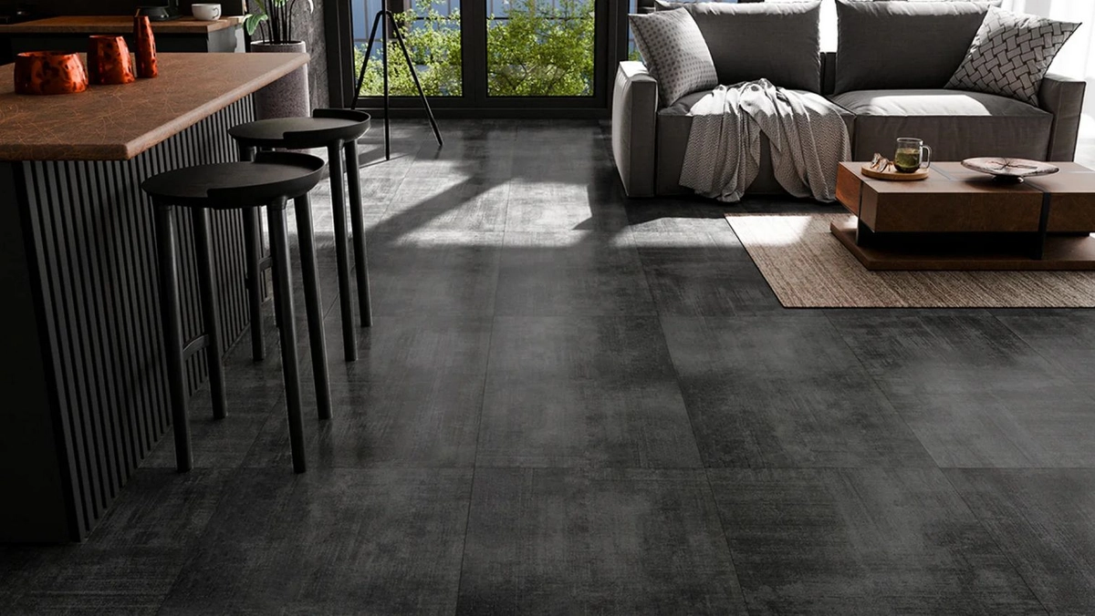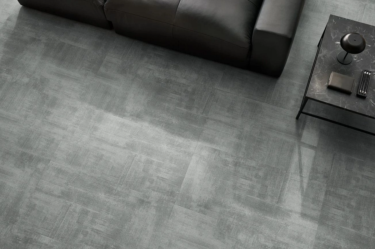 Głęboki, antracytowy odcień i wykończenie przypominające drobno szczotkowany beton. Powierzchnia ma wyraźną, ale stonowaną strukturę z nieregularnymi przebarwieniami, które nadają jej surowy, nowoczesny charakter. Kolor sprawia, że podłoga dobrze współgra zarówno z jasnymi, jak i ciemniejszymi meblami - tworzy mocne tło bez przesadnej dekoracyjności.