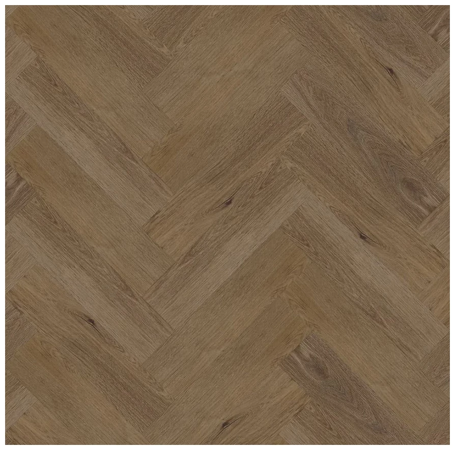 Panel z wyraźnym rysunkiem dębowym w odcieniu średnio-brązowym. Na powierzchni widoczne słoje i nieliczne sęki, które nadają materiałowi bardziej naturalny wygląd. Ułożenie w klasyczną jodełkę jest częścią projektu - struktura i format płytek podkreślają geometryczny rytm podłogi.