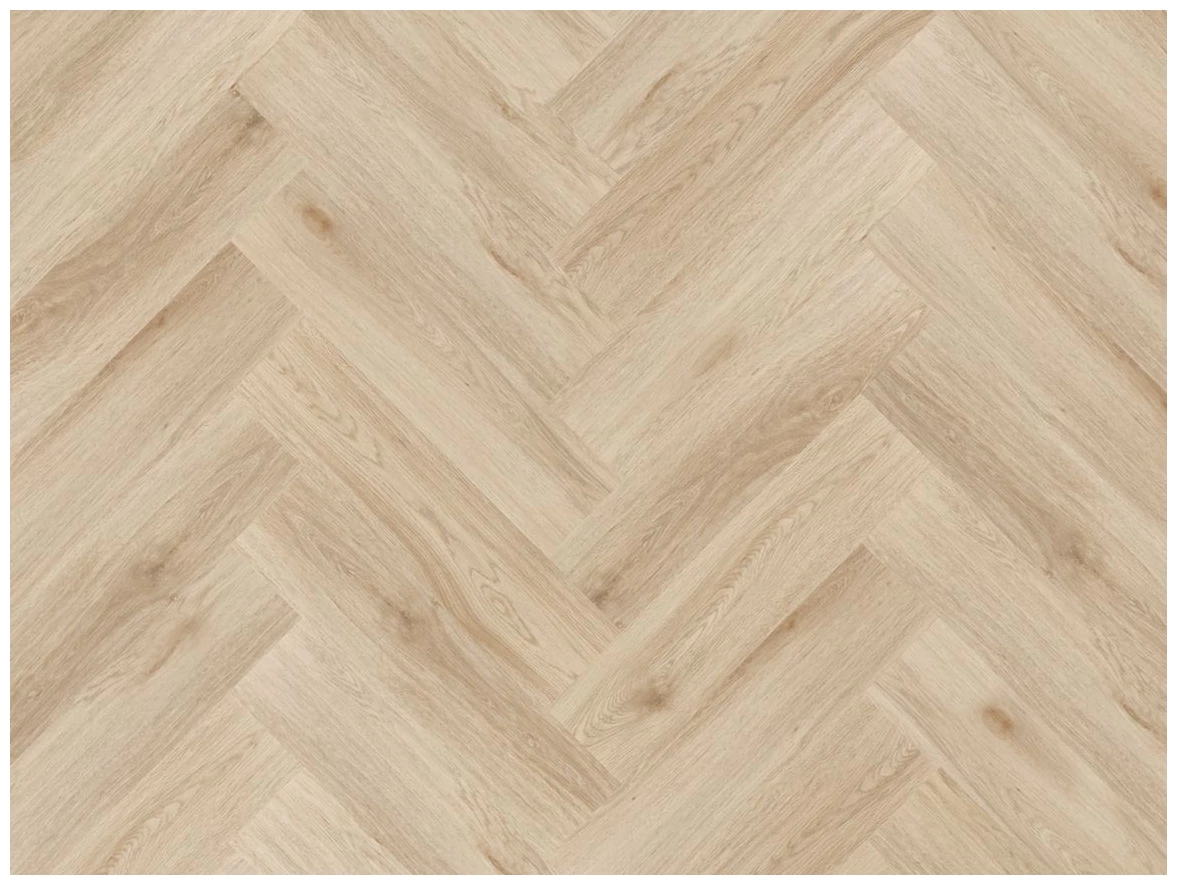 Naturalny, jasny odcień dębu widoczny na panelu tworzy uporządkowaną, ale nie jednolitą fakturę. Słojowanie i delikatne przebarwienia układają się w regularny wzór jodełki, co nadaje powierzchni wyraźną geometrię i uporządkowany rytm. Rozmiar deski 14,8x59,2 cm sprawia, że układ jodełkowy wygląda proporcjonalnie - nie za drobny, nie przytłaczający.