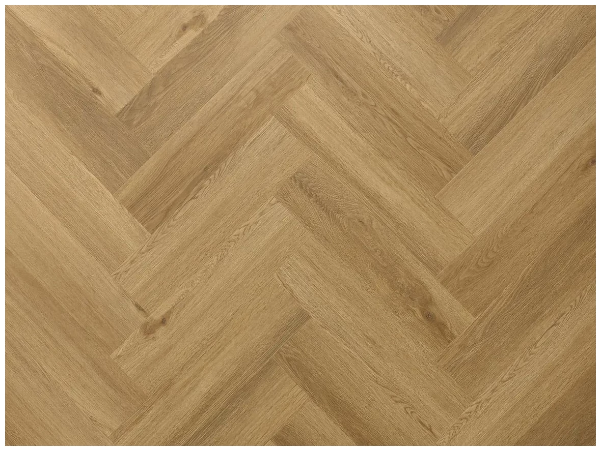 Naturalnie ciepły odcień dębu, wyraźne słoje i pojedyncze sęki - to pierwsze, co zwraca uwagę. Panel pokazuje strukturę drewna w wersji, która nie jest nachalna, kolor jest średnio-jasny, blisko naturalnego dębu, bez silnych kontrastów. Ułożenie w jodełkę nadaje powierzchni rytm i wyrazistość, a faktura EIR (odwzorowanie usłojenia) wzmacnia efekt autentyczności.