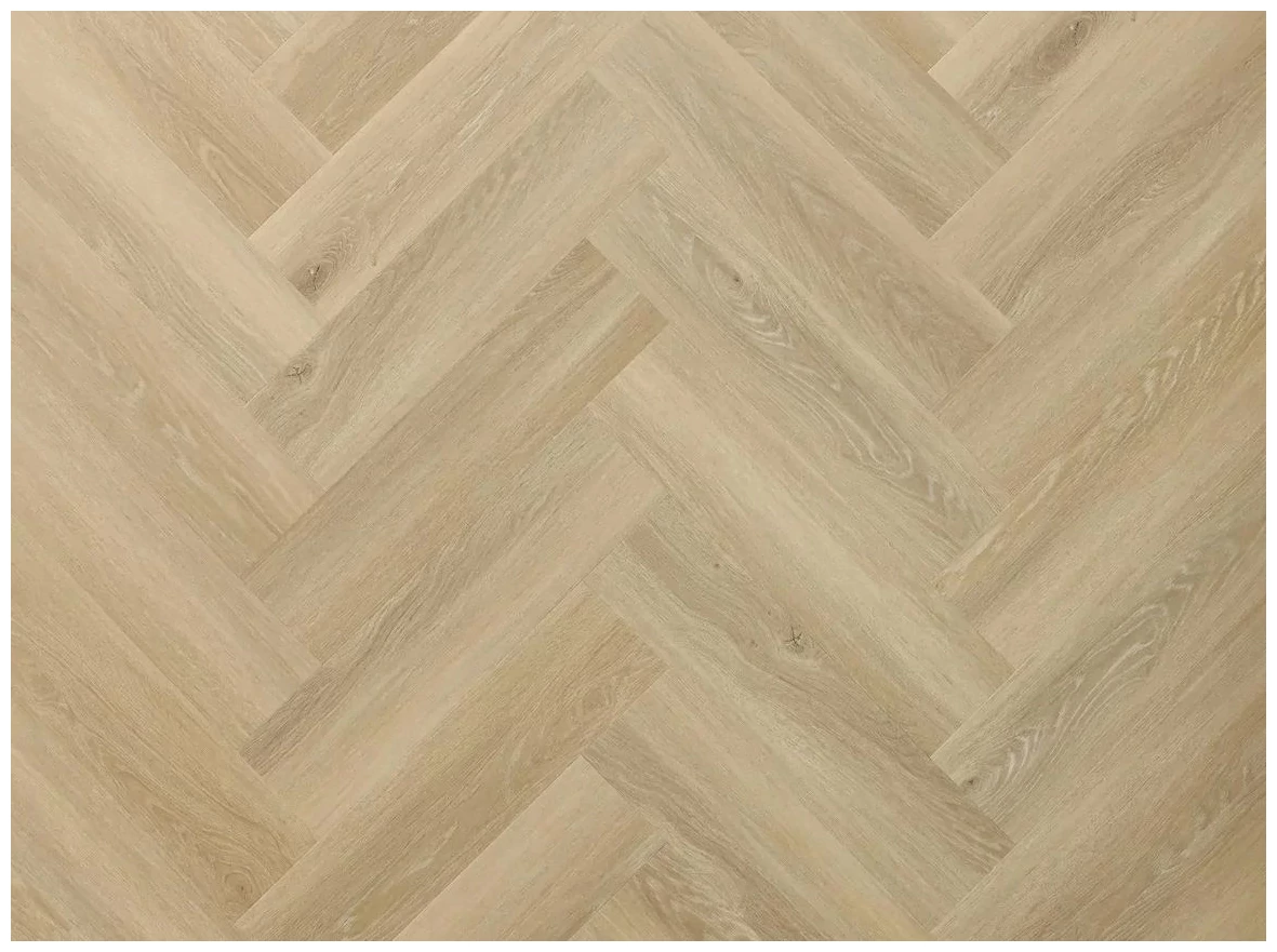 Kolorystyka to jasny dąb o ciepłym, beżowo-miodowym odcieniu. Struktura powierzchni odwzorowuje rysunek słojów i sporadyczne sęki, co tworzy estetykę zbliżoną do naturalnego drewna, jednak bez ostrych kontrastów. Ułożenie w jodełkę podkreśla rytm pokoju - elementy są widoczne, ale nie dominują przestrzeni.