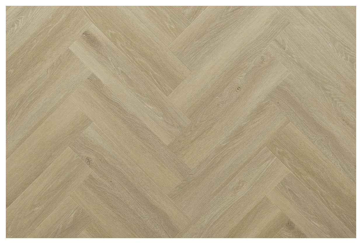 Jasny odcień dębu przedstawiony w układzie jodełki tworzy uporządkowaną, ale nie sztywną powierzchnię. Format 14,8x59,2 nadaje wzorowi proporcje, które działają dobrze zarówno w mniejszych przestrzeniach, jak i w pokojach o większej powierzchni. Struktura EIR (embossed in register) podkreśla usłojenie i naturalne słoje, co zbliża wygląd do tradycyjnej podłogi drewnianej bez jej ograniczeń.