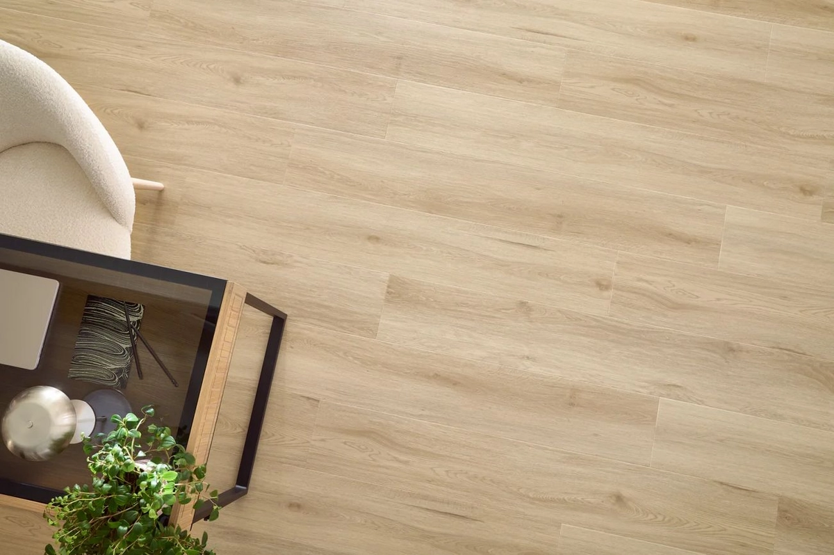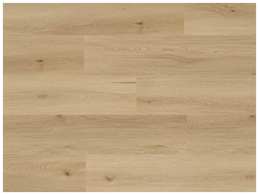 Jasny motyw dębowy, z wyraźnymi, ale stonowanymi słojami i sporadycznymi sękami. Kolorystyka utrzymana jest w ciepłych, beżowo-miodowych tonach, które dobrze współgrają zarówno z chłodniejszymi, jak i cieplejszymi aranżacjami. Powierzchnia wygląda na matową, z delikatną strukturą drewna widoczną w detalach, co sprawia, że panele nie dominują wnętrza, a raczej nadają mu uporządkowany, naturalny charakter.