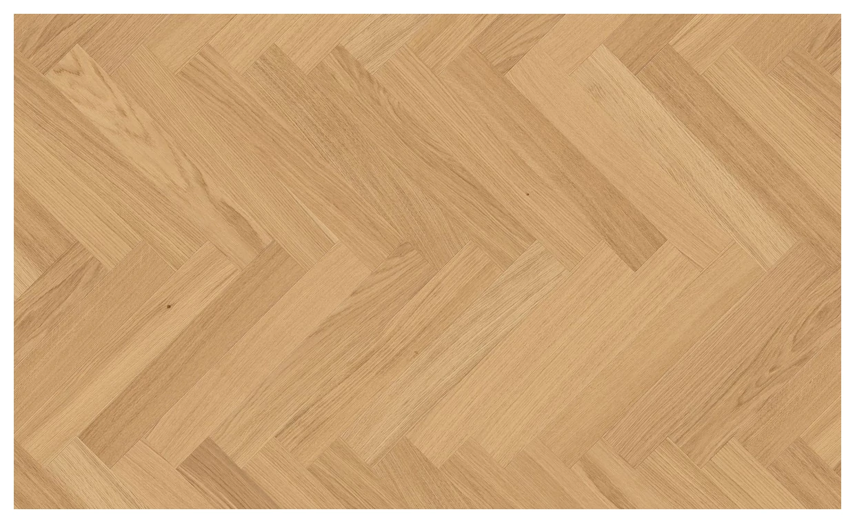 Naturalny, jasny odcień dębu widoczny na panelach tworzy uporządkowaną, ale nie monotonną powierzchnię. Jodełkowy układ podkreśla rytm desek: krótsze elementy układają się pod kątem, co nadaje pomieszczeniu wyraźną strukturę i porządek. Na pierwszy rzut oka widać subtelne usłojenie i delikatne różnice tonów między listwami - estetyka bliska tradycyjnemu parkietowi, ale w formie panelu hybrydowego.