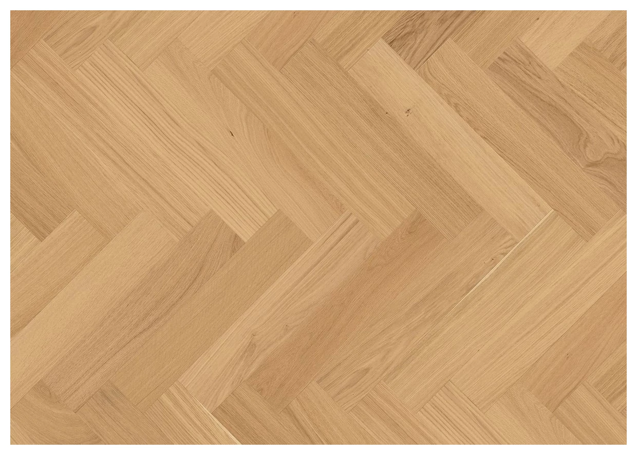 Naturalny odcień dębu widoczny na panelach podkreśla strukturę drewna: wyraźne słoje, subtelne przebarwienia i nieliczne drobne sęki tworzą spójny, stonowany wygląd. Ułożenie w jodełkę dodaje rytmu i porządku - powierzchnia nie jest jednolita, lecz zyskuje wyraźną geometrię, która gra z światłem i kierunkiem wnętrza.