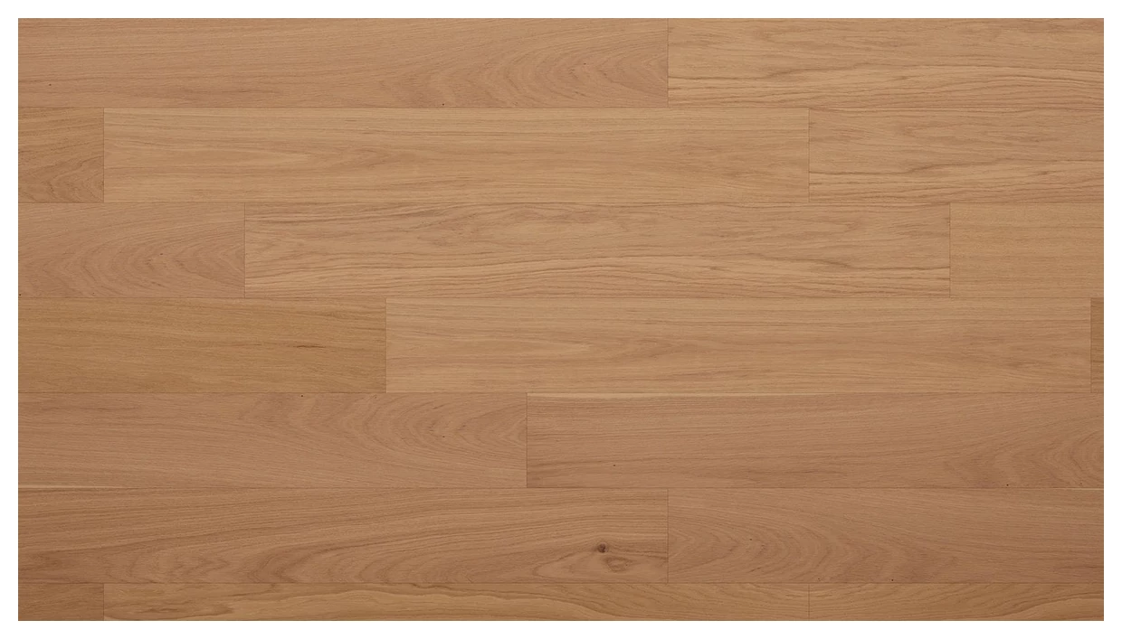 Powierzchnia ma kolor zbliżony do jasnego dębu - ciepła, ale nie przesadnie żółta. Słoje są wyraźne, ale subtelne, widoczne pasma usłojenia i pojedyncze niewielkie sęki tworzą spokojny, uporządkowany wzór. Deski układają się w klasyczny układ, szczeliny między nimi są równe, a faktura wygląda na matową, pozbawioną mocnego połysku.