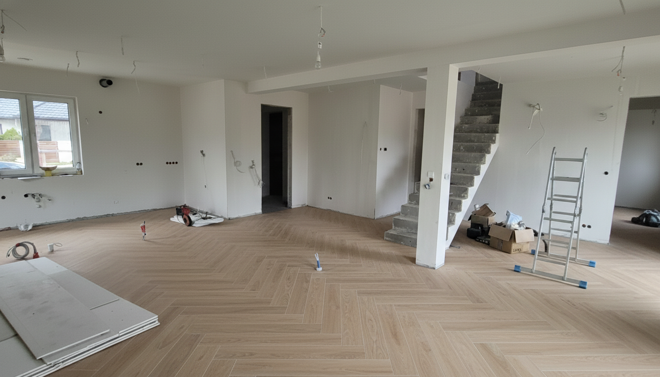 Jodełka wymaga więcej cięć ukośnych niż układ prosty, przez co odpad materiałowy jest wyraźnie wyższy - warto zaplanować zakup z naddatkiem około 10-15%. Przy panelu Barlinek Dąb Lniany SPC DP5000026 warto też wcześniej zaplanować punkt startowy wzoru, żeby jodełka wyglądała symetrycznie.