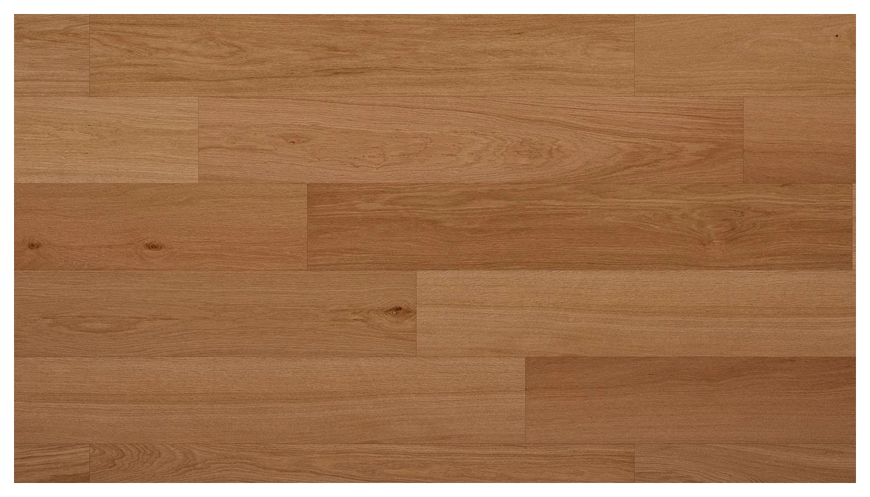 Ta podłoga hybrydowa pokazuje estetykę zbliżoną do litego dębu: średnio ciepły, jednolity odcień drewna z subtelnymi sękami i wyraźnym rysunkiem słoi. Panele układają się w regularne pasy, co daje uporządkowany, ale nie płaski efekt - widoczne są delikatne różnice tonów między poszczególnymi elementami. Wykończenie wydaje się matowe, nie błyszczy intensywnie, dzięki czemu powierzchnia zachowuje naturalny wygląd przy różnym oświetleniu.