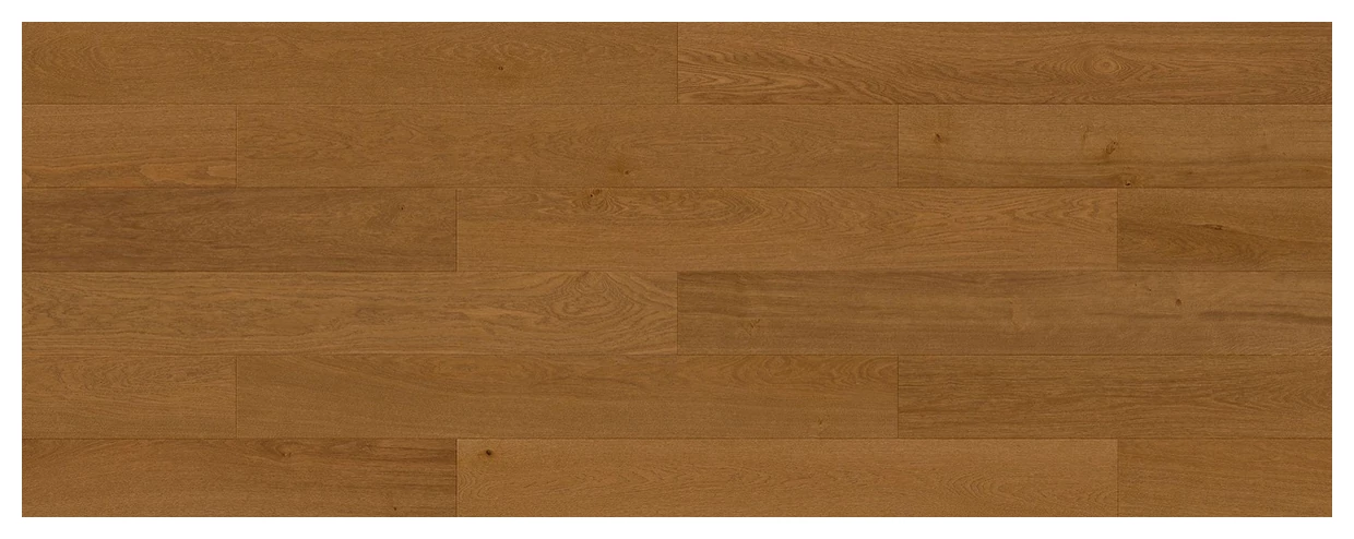 Ta podłoga hybrydowa prezentuje ciepły, dębowy odcień z wyraźnym rysunkiem słojów i nielicznymi, dyskretnymi sękami. Kolor jest zbalansowany - nie za ciemny, nie za jasny - dzięki czemu dobrze odnajdzie się zarówno w przestrzeniach dziennych, jak i w bardziej stonowanych wnętrzach. Deski układają się w regularne pasy, a matowe wykończenie minimalizuje refleksy światła, podkreślając naturalną fakturę powierzchni.