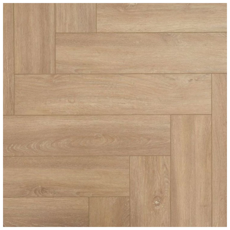 Naturalny, jasny odcień dębu Carmel widoczny na panelu nadaje wnętrzu uporządkowany i nowoczesny charakter. Szerokie deski ułożone w klasyczną jodełkę tworzą regularny rytm podłogi, sęki i słojowa struktura pozostają widoczne, ale nie dominują, co daje uczucie autentycznego drewna bez nadmiaru kontrastu.