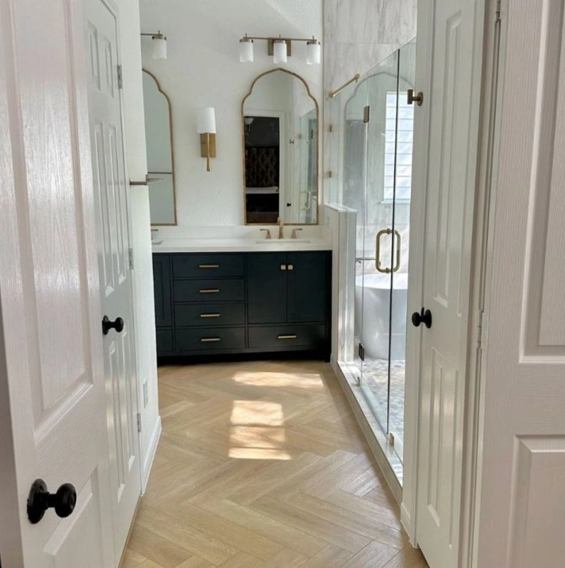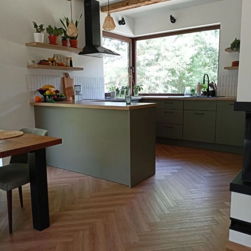 Panel dostarczany jest z zintegrowanym podkładem, co przyspiesza i upraszcza montaż oraz poprawia komfort akustyczny i użytkowy. Układ jodełki wymaga precyzyjnego układania, ale efekt końcowy jest wyraźny i daje wysoką jakość wizualną - szczególnie w dłuższych, prostokątnych pomieszczeniach.