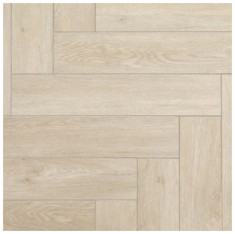 Jasna, stonowana deska w układzie jodełki o wymiarach 59 x 11,8 cm. Widoczna struktura słojów i delikatne sęki podkreślają fakturę drewna, ale kolor pozostaje neutralny - beżowo-jasny ton, który rozjaśni wnętrze bez dominowania nad aranżacją.