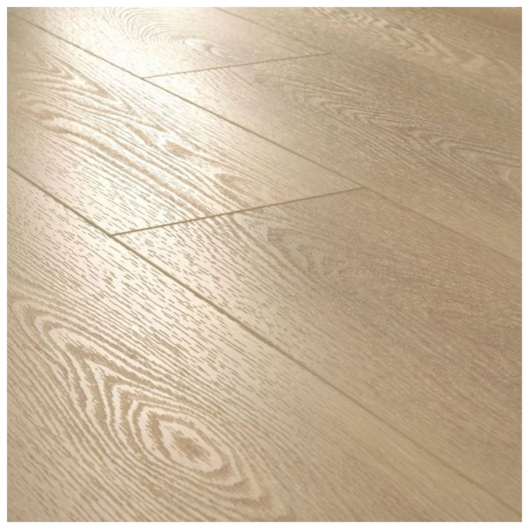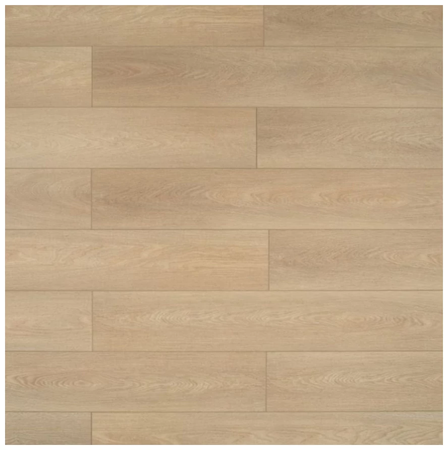 Jasny, stonowany dąb w odcieniu beżowo-piaskowym. Deski pokazują subtelne usłojenie oraz niewielkie różnice tonalne między elementami, co sprawia, że powierzchnia wygląda spójnie, ale nie jednolicie. Powierzchnia ma matowe wykończenie i naturalny wygląd drewna bez wyraźnego połysku.