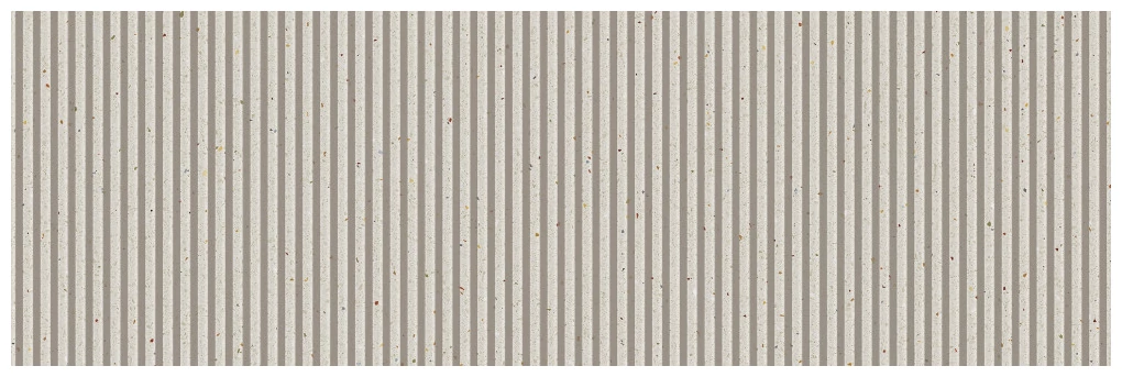 Ta wersja lastryko, czyli efekt powierzchni przypominający naturalny, drobnoziarnisty kamień z inkluzjami, dodaje płytkom nieoczywistego charakteru, komponując się z ich liniowym ryflowaniem. Całość prezentuje się neutralnie, ale jednocześnie z wyraźnym akcentem na strukturę, która gra tu pierwsze skrzypce.