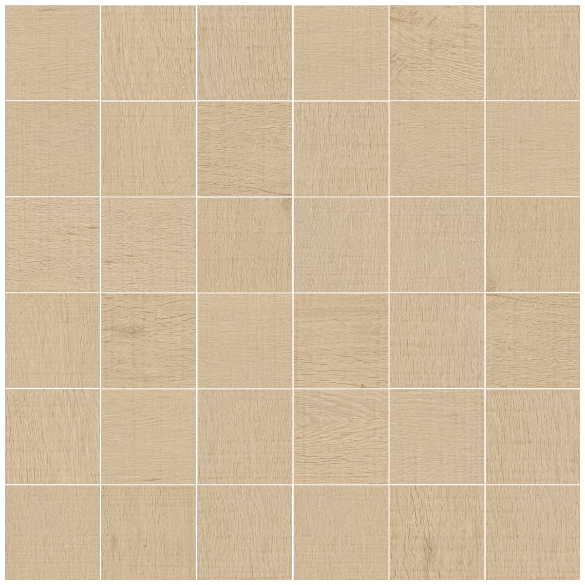 Norway Maple 5x5 mozaika o wymiarach 29,75x29,75 cm to ułożone w regularna siatkę kwadraty, które dzięki matowej powierzchni i efektowi drewna prezentują się bardzo autentycznie. Kolorystyka utrzymana jest w delikatnym, beżowym odcieniu, który łatwo dopasować do różnych aranżacji. Wyraźne usłojenia drewna, choć subtelne, dodają całości rustykalnego stylu, co nie jest często spotykane w gresie o takiej strukturze. Mimo mnożenia małych elementów, wzór nie jest monotonny - każdy kafelek ma trochę inną fakturę, co wzmacnia naturalny charakter produktu.