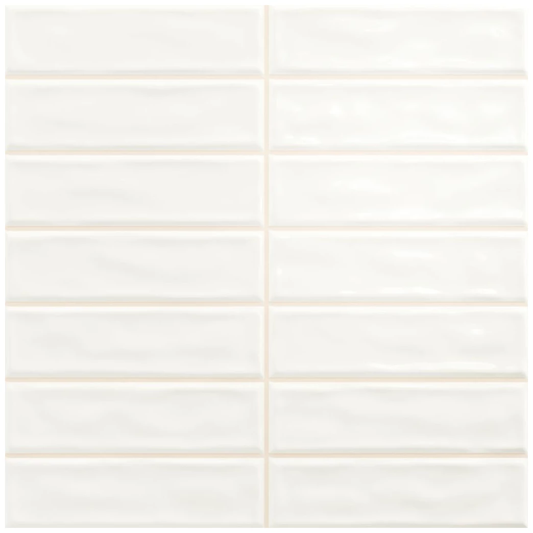 Ta płytka ścienna przykuwa uwagę delikatną bielą w odcieniu naturalnym, nie krzykliwym, ale dającym wrażenie świeżości. Powierzchnia jest błyszcząca, co podkreśla światło i optycznie powiększa przestrzeń. Każda płytka ma strukturę wyraźnie zaznaczonych, lekko nieregularnych krawędzi i subtelne wybrzuszenia, które tworzą naturalny efekt rustykalny - nie jest to gładka, idealnie równa tafla, lecz materiał z wyczuwalną charakterystyczną fakturą.