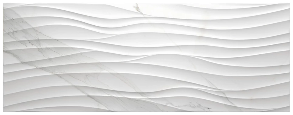 Marbox Calacatta Surf to glazura ścienna o wymiarach 44,63x119,3 cm, która zwraca uwagę swoją wyraźną, strukturalną powierzchnią. Charakterystyczne, faliste wyżłobienia nadają płytce oryginalny efekt, który wyróżnia ją spośród klasycznych, gładkich modeli. Dzięki błyszczącej powłoce, całość nabiera wyrazistości i delikatnie odbija światło, co może optycznie powiększyć i rozjaśnić wybrane wnętrza.