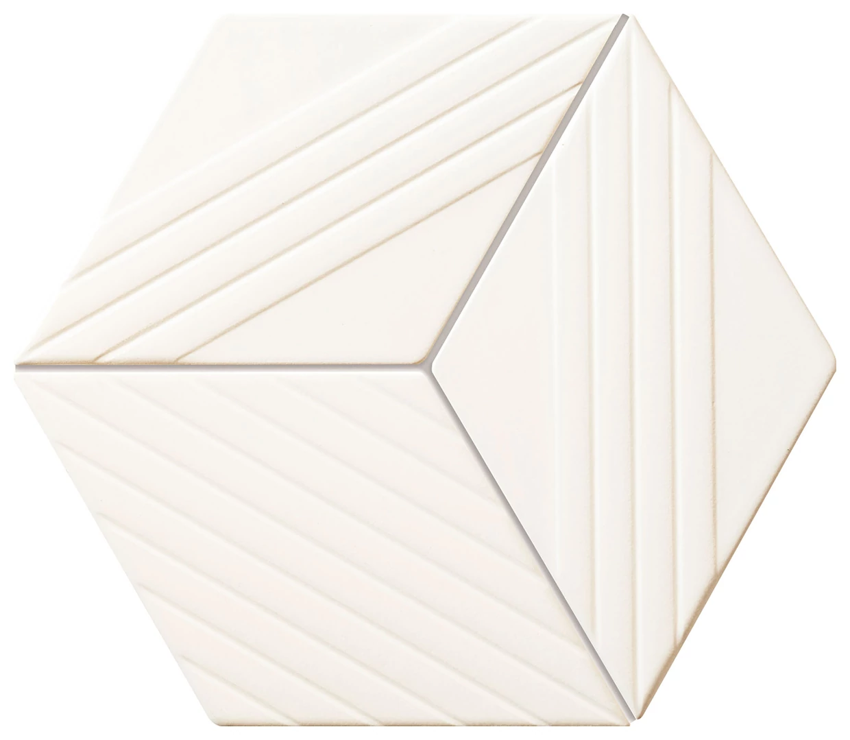 Biała mozaika 3D do kuchni i łazienki, którą przedstawia ten produkt, przyciąga uwagę nietypowym heksagonalnym kształtem. Każdy element ma rozmiar 19,8x22,6 cm i jest wykończony w delikatnej satynowej powierzchni, co nadaje jej stonowany, lecz wyraźny połysk. Zauważalna struktura ozdobiona jest subtelnymi, liniowymi żłobieniami, układającymi się pod różnymi kątami, które nadają mozaice wyraźny trójwymiarowy efekt. Ta cecha wizualna dodaje wnętrzom głębi i ciekawości.