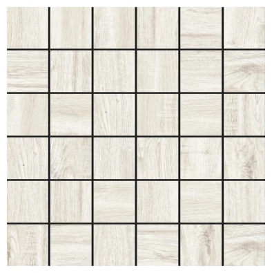 Produkt Camper White 5x5 to biała mozaika gresowa, która przyciąga uwagę swoim minimalistycznym, a zarazem wyrazistym wzorem. Każdy kwadrat o wymiarze 29,75x29,75 cm tworzy spójną całość, jednak wyraźna struktura drewna oddaje naturalny charakter powierzchni. To matowe wykończenie z rektyfikacją gwarantuje równą, prostą krawędź, co ułatwia precyzyjny montaż i sprawia, że efekt wizualny jest schludny, jednolity, bez widocznych różnic wysokości. Całość prezentuje się lekko surowo i czytelnie, co nadaje powierzchni sporo przestrzenności.