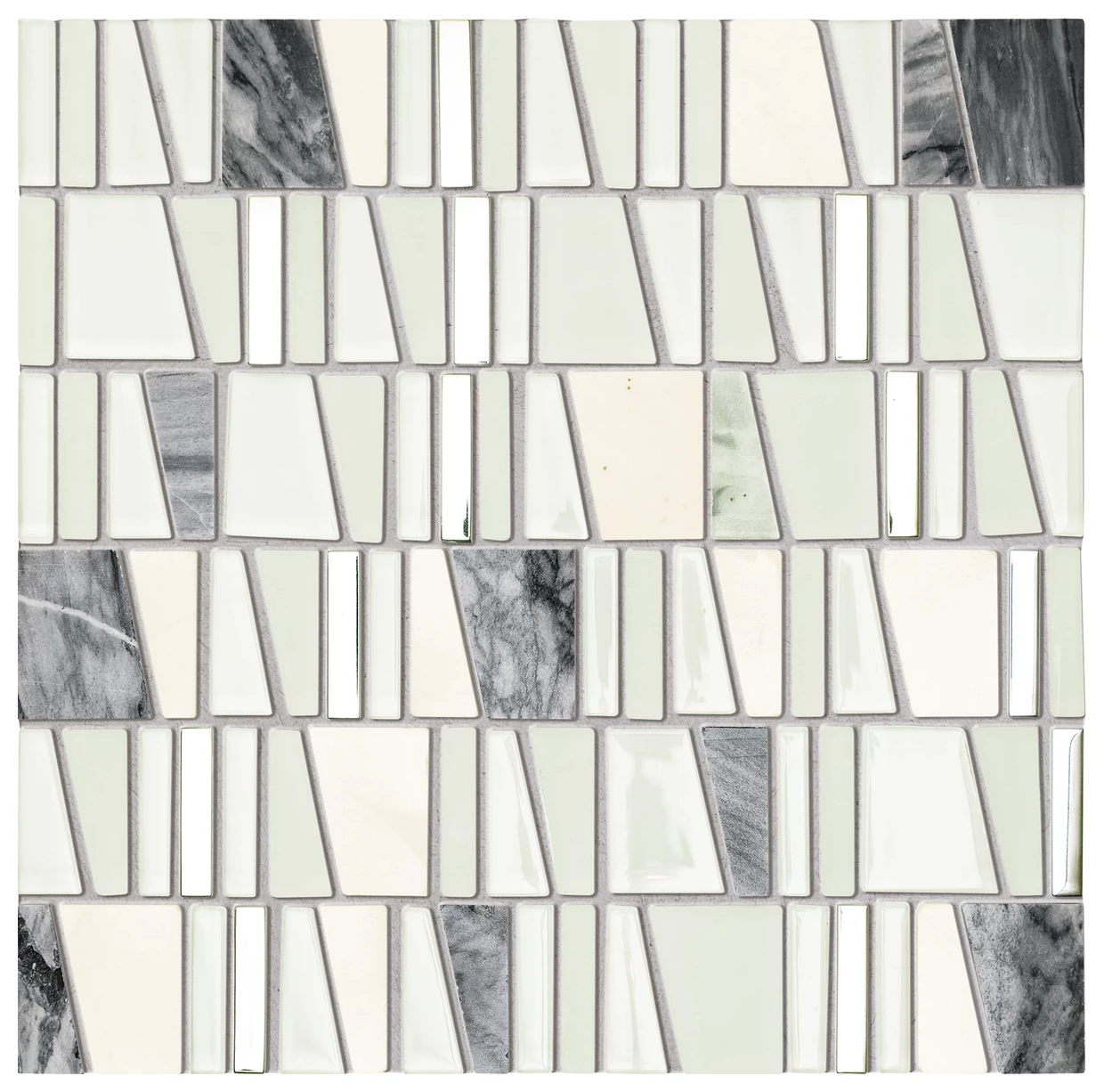 Drops Stone White to mozaika o wyraźnie geometrycznym układzie elementów, przełamanych nieregularnymi kształtami tworzącymi dynamiczny wzór. Utrzymana w jasnej, białej tonacji z dodatkiem szarości i naturalnych marmurowych przebarwień, które nadają całości interesujący, nierównomierny efekt. Powierzchnia jest lappato, co oznacza, że płytki mają lekko matowy połysk, który łagodzi odbicie światła i potęguje wrażenie głębi.