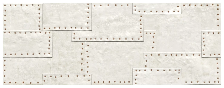 Grunge White Fizz to biała płytka ścienna o wymiarach 44,63x119,3 cm. W jej powierzchni można dostrzec prosty, a jednocześnie charakterystyczny wzór przypominający metalowe płyty łączone nitami. Ten motyw dobrze wpisuje się w stylistykę industrialną i nadaje wnętrzu surowy, techniczny wygląd. Nie jest to gładka i jednolita płytka - jej powierzchnia ma lekko matową fakturę oraz wyczuwalną strukturę, co podkreśla charakter efektu metalicznego, ale bez połysku.