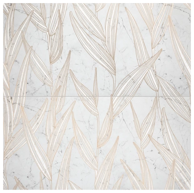 Lily Leaves 2 to dwuelementowy dekor o wymiarze 59,8x59,8 cm, który zwraca uwagę przez swoją błyszczącą powierzchnię. Połączenie jasnego tła z delikatnym wzorem liści, wykonanych w stonowanych odcieniach beżu i bieli, nadaje powierzchni lekkości i nowoczesnego charakteru. Ten błyszczący płytka dekoracyjna do kuchni i łazienki może odmienić przestrzeń, wprowadzając do niej uporządkowany wzór, który jednocześnie nie przytłacza wnętrza. Lakierowana powierzchnia odbija światło, dodając głębi kompozycji.