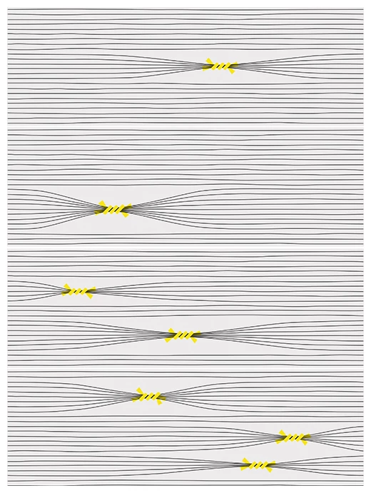 Wzór to starannie zaprojektowana sekwencja, gdzie cienkie ciemnoszare linie łagodnie przeplatają się i skupiają na małych żółtych wstawkach, co stoi w dysharmonii z całością, ale w praktyce daje ciekawy efekt i zaprasza do dłuższego przyjrzenia się. Czysta, błyszcząca powierzchnia odbija światło, podkreślając zarówno strukturę, jak i kształt płytki.