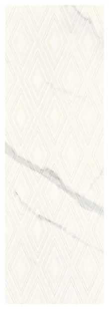 Livia Bianco dekor 25x75 marki Paradyz to błyszcząca płytka dekoracyjna łazienkowa i kuchenna. Ma rozmiar 25x75 cm, który pozwala na stworzenie ciekawych aranżacji ścian. Na jasnym tle, które przypomina marmur, widoczne są geometryczne, romboidalne wzory z delikatnym efektem reliefu. To nie jest po prostu płaska powierzchnia - płytka ma lekko wypukły wzór, który wprowadza przestrzenność do wnętrza. Całość ma wykończenie na wysoki połysk, co zwiększa efekt luksusu i podkreśla detale.