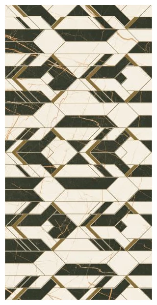 Błyszcząca płytka dekoracyjna ze wzorem geometrycznym to propozycja o wyraźnie zarysowanych liniach i kształtach. Na powierzchni płytki dostrzegalne są wielokątne elementy ułożone w powtarzalny, ale jednocześnie zróżnicowany układ. Kolorystyka opiera się na kontrastujących odcieniach czerni i bieli, z delikatnymi złotymi żyłkami, które dodają subtelnej elegancji i nieco przełamują surowość wzoru.