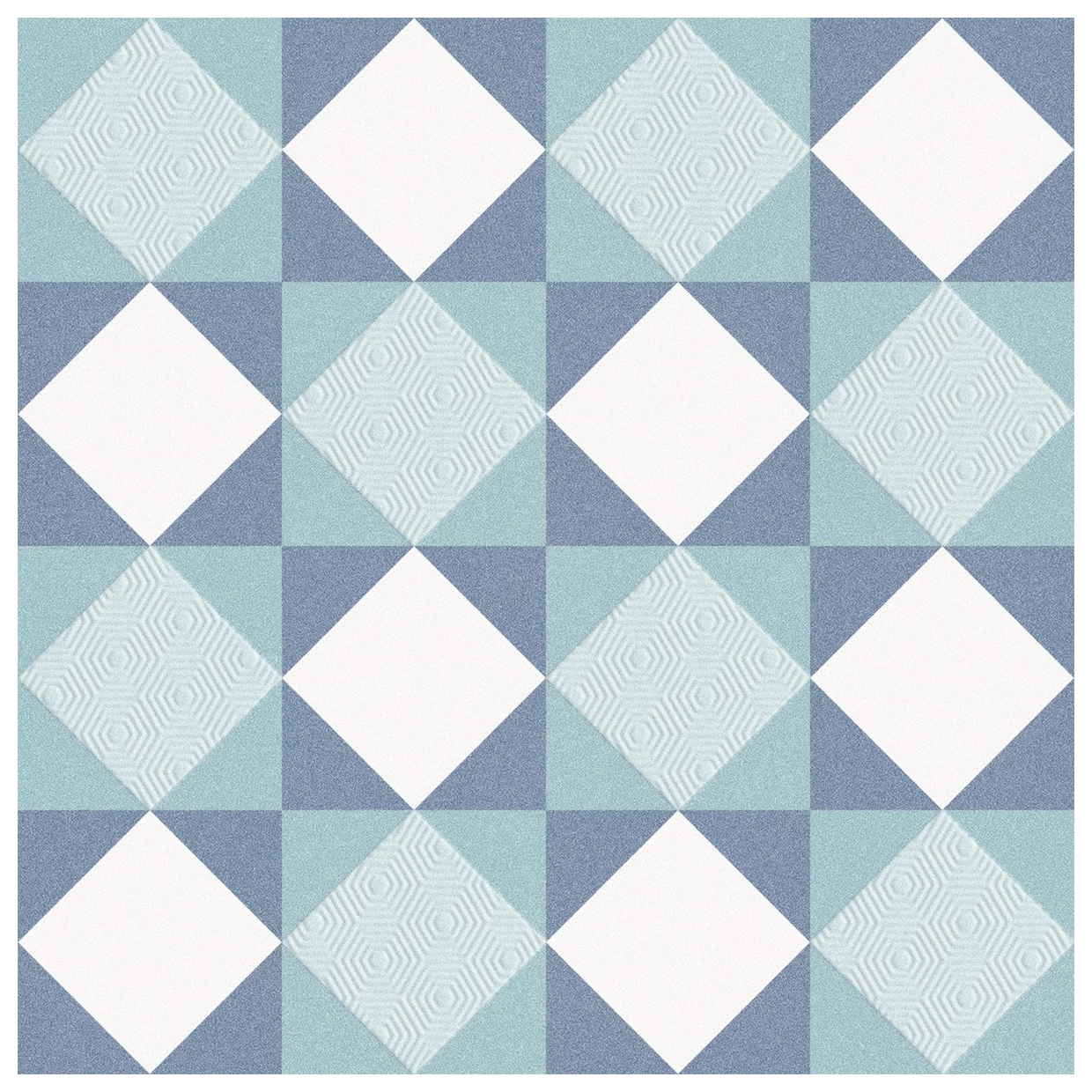 Mallorca Calobra gres 25x25 to przykład dużych płytek podłogowych, które swoją formą i wykończeniem zwracają uwagę. Powierzchnia jest błyszcząca, co nadaje glazurowanej strukturze intensywności i wyrazistości. Geometryczny wzór to przemyślany układ kształtów - białe i niebieskawe elementy o różnych odcieniach, połączone w wyraźne wzory zróżnicowanej faktury.