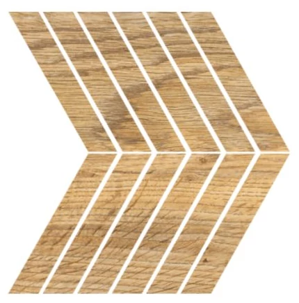Wood Essence Natural mozaika 25x25 to płytki gresowe o wykończeniu przypominającym naturalne drewno. Ich kolorystyka oscyluje wokół odcieni brązu, które subtelnie naśladują słojowanie drewna, choć wzór jest ułożony w charakterystyczną jodełkę. Ta mozaika składa się z dużych, regularnych elementów, które tworzą dynamiczny i wyrazisty wzór. Matowa powierzchnia zapobiega niepożądanemu refleksowi światła, dzięki czemu płytki prezentują się naturalnie i wyraźnie, co jest istotne dla osób szukających estetyki zbliżonej do tradycyjnego drewna.