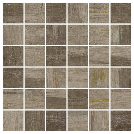 Whisper Beige Natural to mozaika gresowa o wymiarach 29,75x29,75 cm, składająca się z małych kwadratowych elementów 5x5 cm. Kolorystyka utrzymana jest w brązowych tonacjach z wyraźnymi, rustykalnymi teksturami przypominającymi naturalne materiały. Poszczególne elementy mają różne odcienie i wzory powierzchni, co nadaje całości niejednorodny i autentyczny charakter. Matowe wykończenie podkreśla naturalny styl i dodaje lekko stonowanej surowości.