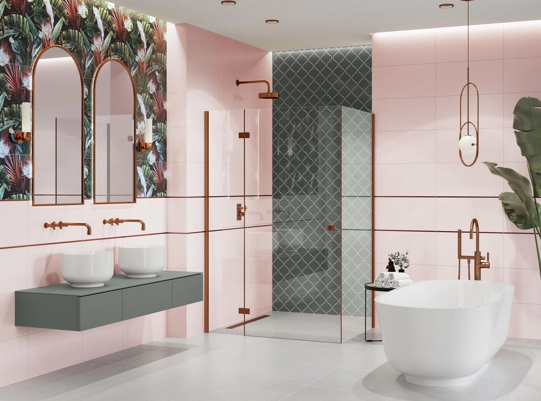 Stwórz przyciągającą wzrok kompozycję na ścianie w kabinie prysznicowej lub nad wanną. Połączenie rektyfikowanych krawędzi oraz mieszanki kolorów sprawi, że łazienka nabierze elegancji i świeżości.