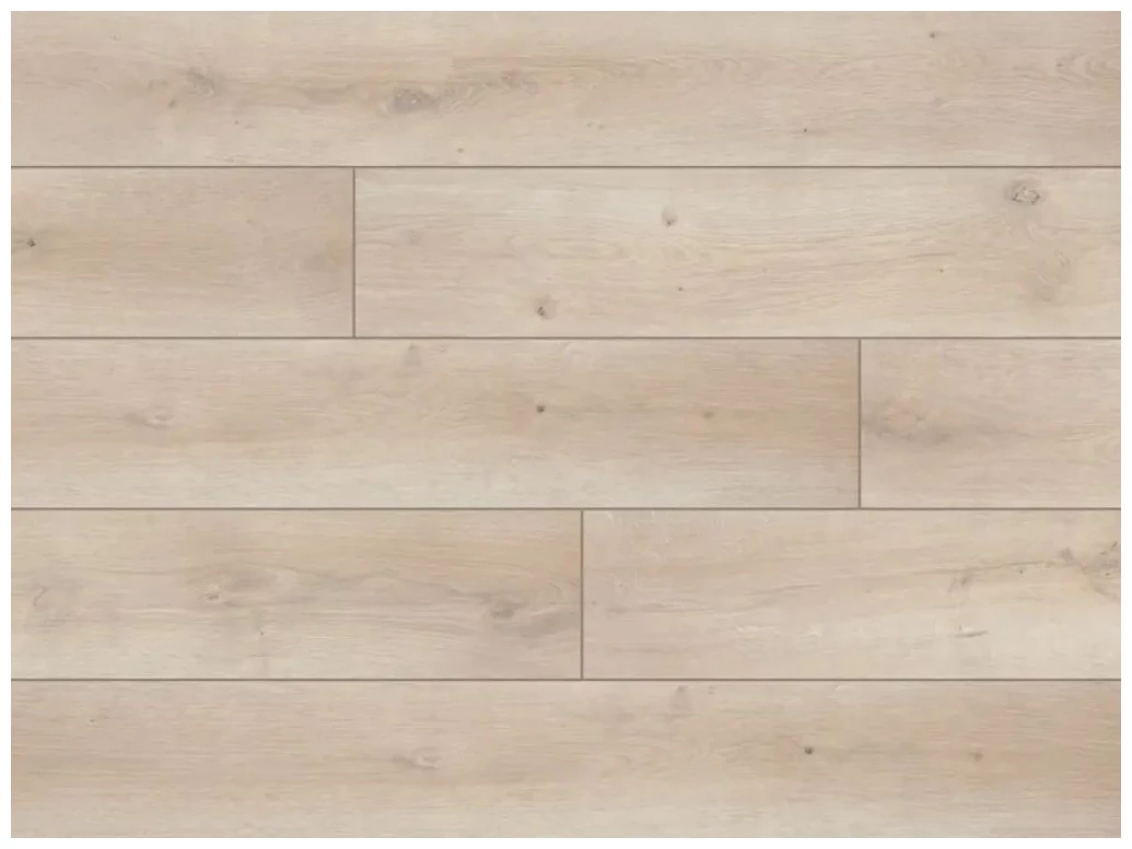 Jasny odcień dębu, z wyraźnymi słojami i miejscowymi sękami - to pierwsze, co zwraca uwagę. Panele pokazują stonowaną, beżową tonację drewna, która rozjaśnia wnętrze i współgra z różnymi kolorami ścian i mebli. Widoczna struktura linii i naturalne przebarwienia tworzą uporządkowany, ale niejednolity wzór, dzięki temu podłoga wygląda autentycznie, a jednocześnie pozostaje stonowana i elegancka.