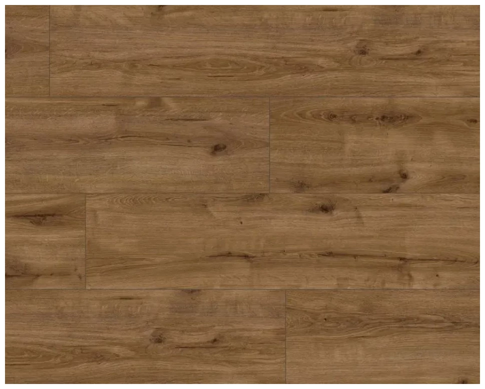 Panel podłogowy SKY Line Heber XL 56200 prezentuje jasnobrązową tonację z widocznym usłojeniem i naturalnymi sękami. Przekaz wizualny jest stonowany i uporządkowany - deski wyglądają jak przycięte tak, aby zachować rytm dekoru. Rysunek słojów jest czytelny, a kolor mieści się w gamie ciepłych brązów, co daje poczucie przytulności bez przesadnej dekoracyjności.