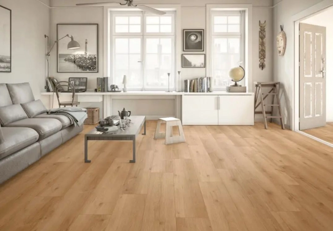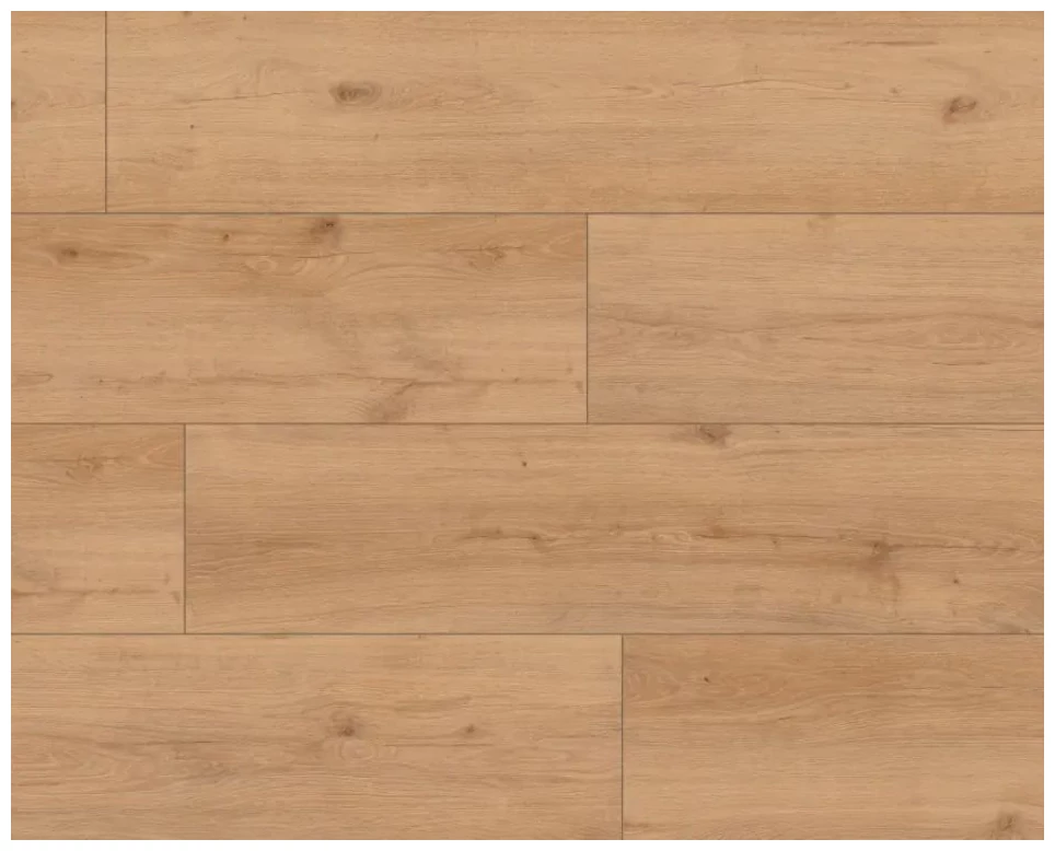 Panel podłogowy SKY Line Salome XL 56198 prezentuje jasny, dębowy dekor z widocznymi słojami i sporadycznymi sękami. Deski układają się w szerokie pasy, powierzchnia ma delikatny, matowy charakter, który redukuje odbicia światła i sprawia, że rysy są mniej widoczne. W efekcie podłoga wygląda naturalnie, ale bez nadmiernej przesady w usłojeniu.