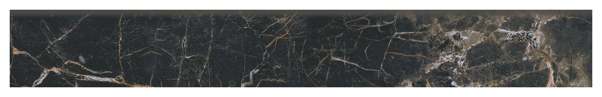 Marquina Gold cokół to gres cokołowy matowy imitujący marmur, który przykuwa uwagę unikalnym, ciemnym wzorem. Widoczna struktura z wyraźnymi żyłkami w ciepłych odcieniach złota i bieli tworzy efekt, który bardziej przypomina naturalny kamień niż standardową płytkę. Powierzchnia jest matowa, co zapobiega nadmiernym odblaskom światła, pozostawiając subtelny i elegancki wygląd elementu. Ten detal sprawia, że cokół nabiera prawdziwej wyrazistości, lecz nie jest przy tym krzykliwy.