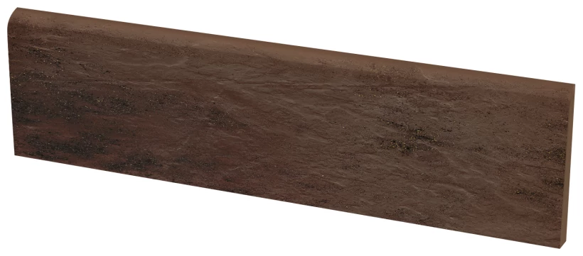 Semir Brown cokol 8,1x30x0,8 to element elewacji o wyraźnej, matowej powierzchni. Barwa to głęboki, brązowy odcień, który prezentuje się dość jednolicie, z subtelnymi niuansami, nadającymi mu naturalny charakter. Faktura jest strukturalna, co oznacza, że jest lekko nierówna i przypomina surową, kamienną powierzchnię. To sprawia, że cokołowi daleko do gładkich płytek - powierzchnia przykuwa wzrok przez swoją wyrazistość i autentyczność.