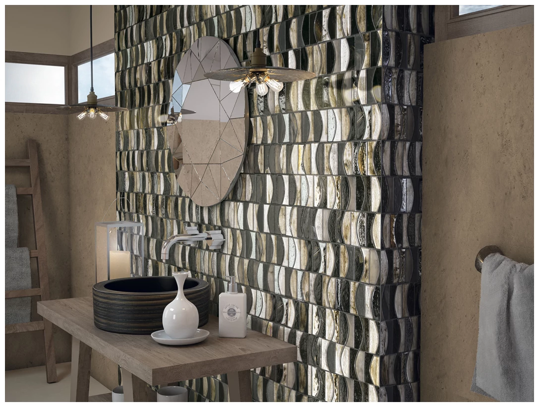 W łazience mozaika szklana doskonale podkreśli strefę prysznica lub wannę. Możesz również użyć jej do stworzenia dekoracyjnych pasów, które ożywią jednolite płytki. Dzięki wykończeniu lappato, powierzchnia mozaiki delikatnie odbija światło, co optycznie powiększa pomieszczenie.