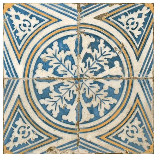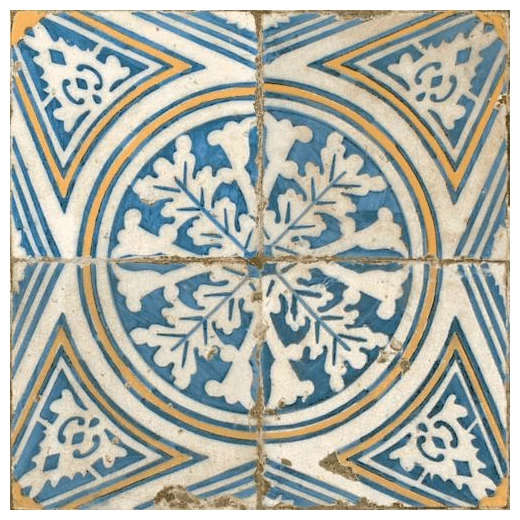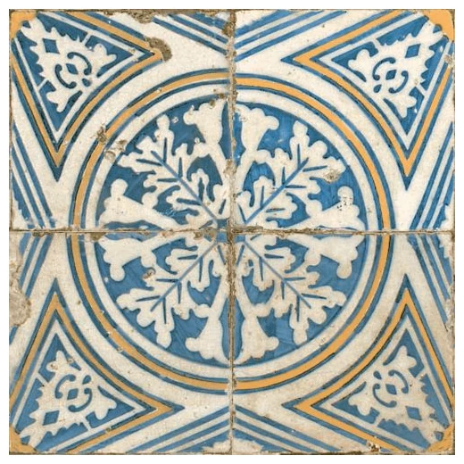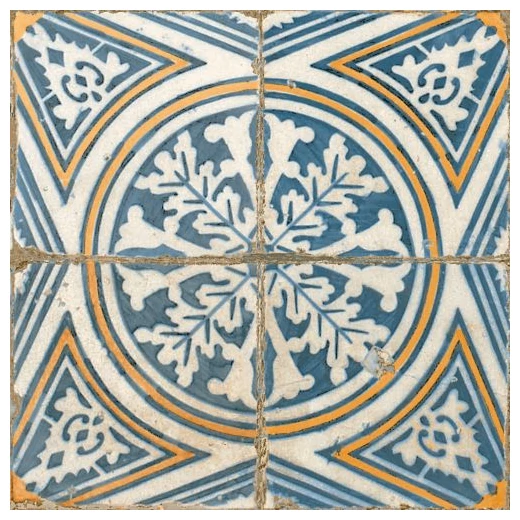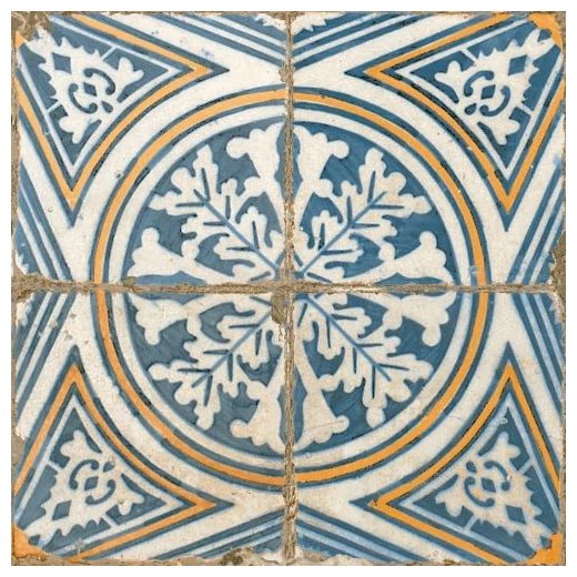 FS 1 płytka podłogowa o wymiarze 45x45 cm to wyraźny przykład dużej, matowej płytki hiszpańskiej, która przyciąga uwagę niebanalnym wzorem i kolorystyką. Na pierwszym planie jest motyw geometryczno-roślinny utrzymany w odcieniach bieli, niebieskiego i złota. Matowa powierzchnia przekłada się na fakturę, która nie błyszczy, co daje naturalny efekt i ogranicza efekt ślizgania się pod stopami.