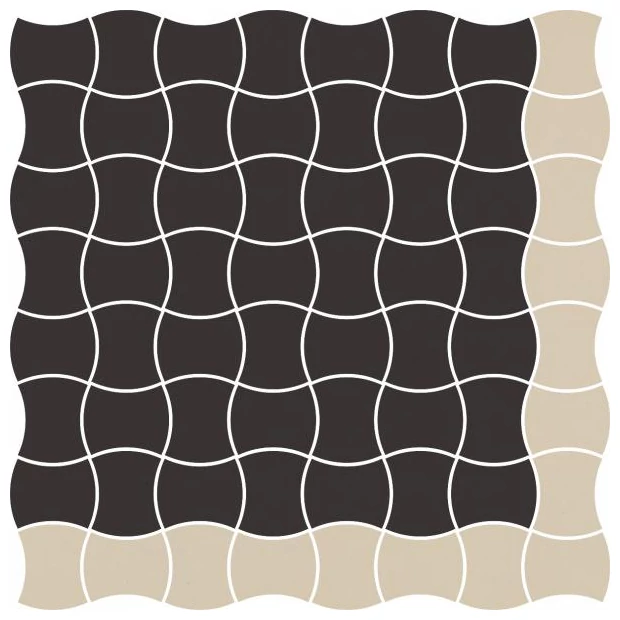 Wzór tej mozaiki opiera się na wyraźnych, geometrycznych elementach o regularnym układzie. Czarna powierzchnia głównej części z beżowymi detalami na krawędzi tworzy wyraźny, kontrastowy efekt. Kształt pojedynczych elementów mozaiki jest lekko zaokrąglony, co nadaje całości nieco lekkości, mimo dość surowej kolorystyki.