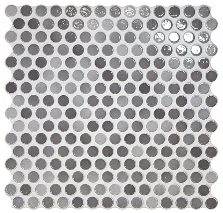 Mozaika w kolorze szarości to niezwykle uniwersalny wybór, który można zestawić z różnymi elementami wystroju. W połączeniu z jasnymi meblami i dodatkami stworzy delikatną i stonowaną kompozycję. Z kolei w towarzystwie ciemniejszych akcentów pozwoli stworzyć bardziej wyrazisty efekt. Błyszcząca powierzchnia mozaiki doda przestrzeni głębi, a okrągłe elementy wzoru sprawią, że wystrój nabierze niepowtarzalnego charakteru.